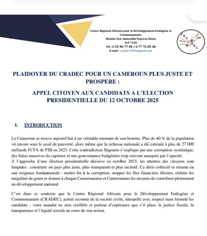 À l’approche des élections présidentielles de 2025, le Centre Régional Africain pour le Développement Endogène et Communautaire (Cradec) sonne l’alarme et propose une feuille de route audacieuse pour les futurs dirigeants du Cameroun. À travers un plaidoyer incisif, l’organisation appelle à une gouvernance intègre, une justice fiscale et une redistribution équitable des richesses. L’objectif est clair : restaurer la confiance des citoyens et bâtir une nation où la prospérité est partagée par tous.